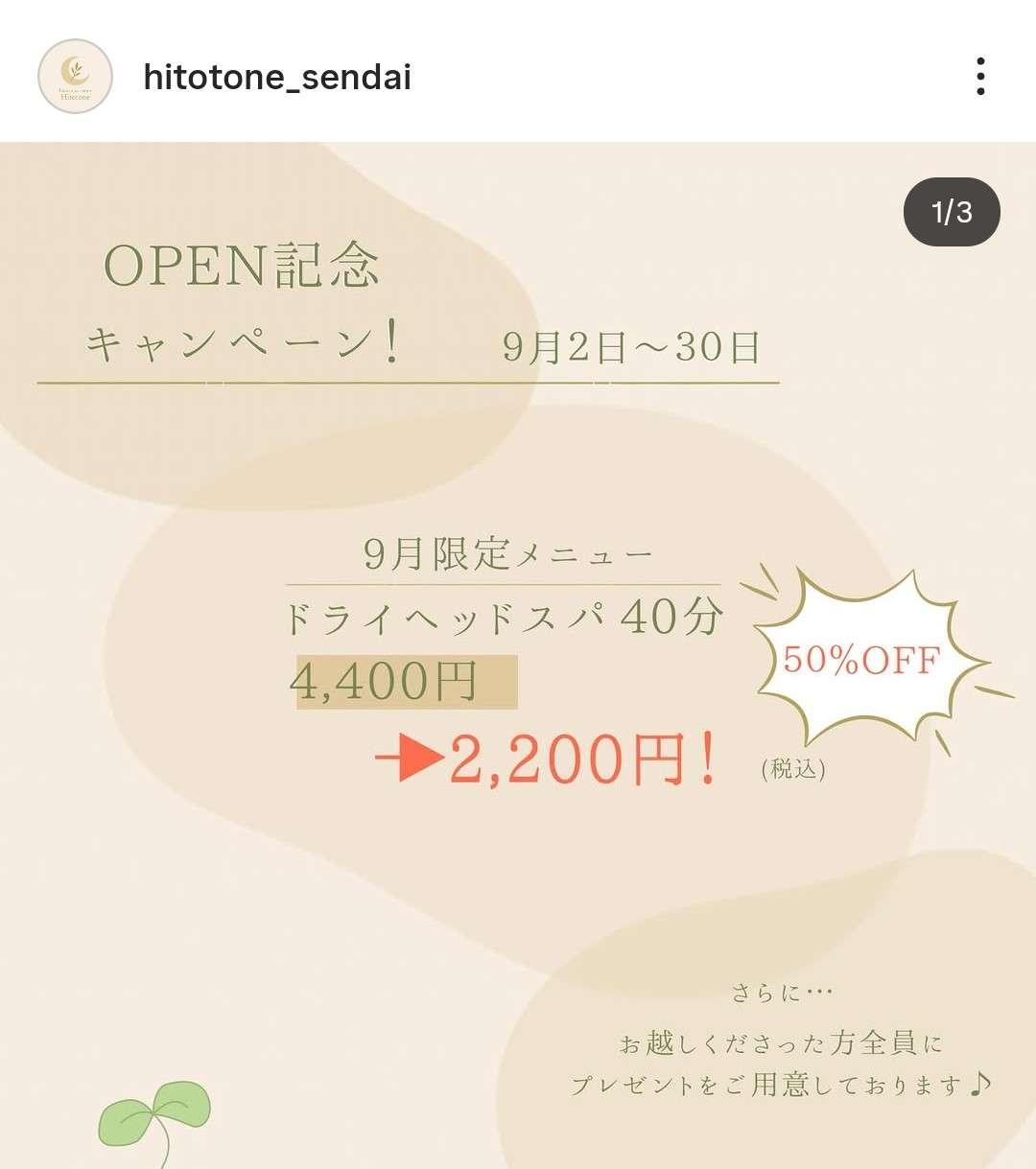 【グランドオープン】💐head spa room Hitotone 2025/09/02 本日9/2(火)、head spa room Hitotoneがグランドオープンしました。 プレオープン期間中は多くの方にお越しいただき、心から感謝申し上げます。 皆さまから嬉しい感想もいただきまして、ぜひInstagramもご覧ください。 9月中はグランドオープンを記念して、限定メニューのご案内もしております。 ※Instagramより ぜひ、ひと休みしたくなったらお気軽にお越しくださいね(^^)